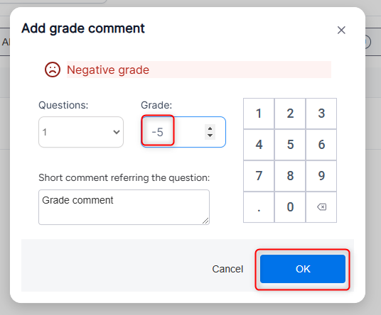 For the purpose of demonstration, we will choose the minus button, deduct 10 points from question 1, and add a comment. Afterward, simply press the OK button.