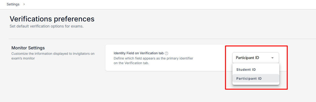 Then, in the Verification preferences, choose between Student ID and Participant ID:
