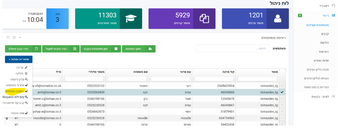 משתמש מנהל מערכת יכול כעת לבחור משתמש ומתפריט האפשרויות הנוספות להפעיל/להשבית את המשתמש.