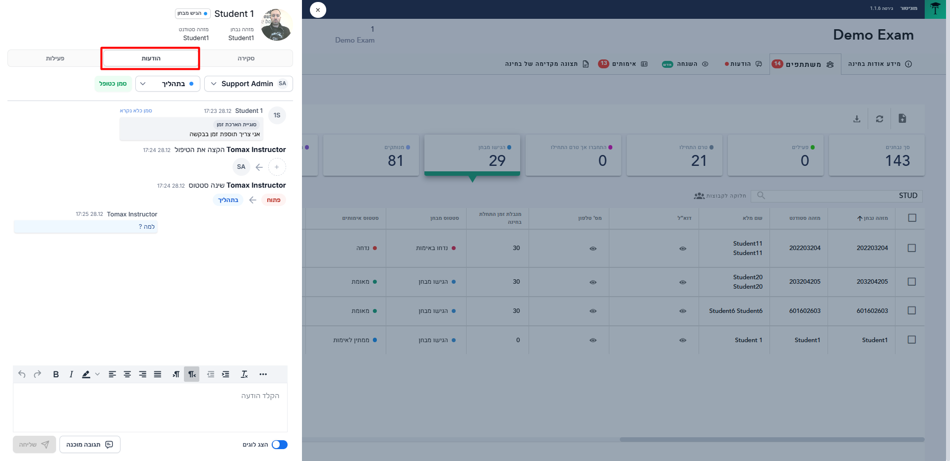 הפאנל יציג שלוש לשוניות (לשונית של סקירה כללית אודות משתתף בבחינה, לשונית של הודעות בבחינה ולשונית של פעילות הסטודנט לפני/במהלך הבחינה).