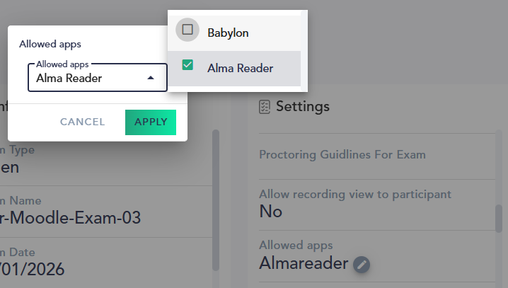 אדמינים במודל יכולים כעת לבחור תוכנות שSEB יאפשר להפעיל במהלך מבחני אונליין במודל, מדובר בתכנות הקראה אלמה רידר ובבילון, ניתן יהיה לבחור אותן גם במוניטור במהלך בחינה: